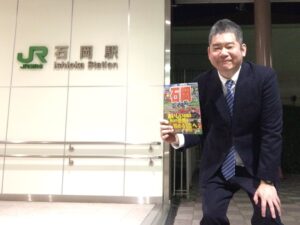 手に持っているのは、宿泊先で入手した石岡版の「るるぶ」です。