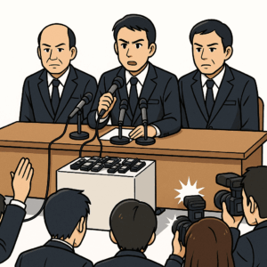 緊急記者会見の会見卓。私が注目したのは多数のマイクの前にある「小さな台」です。