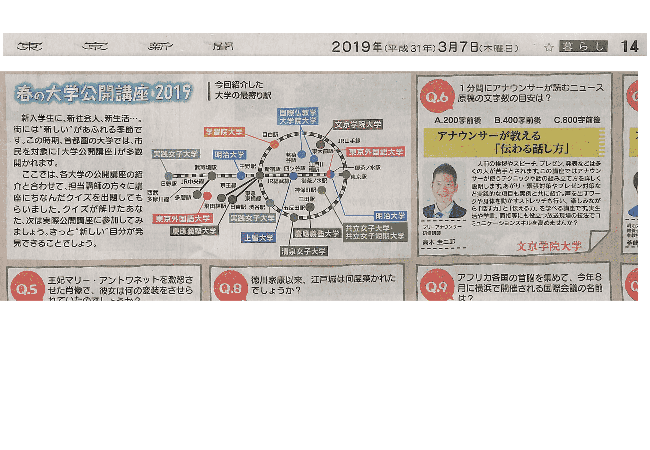 東京新聞の広告記事「春の大学公開講座2019」で文京学院大学生涯学習センターの講座情報が掲載。