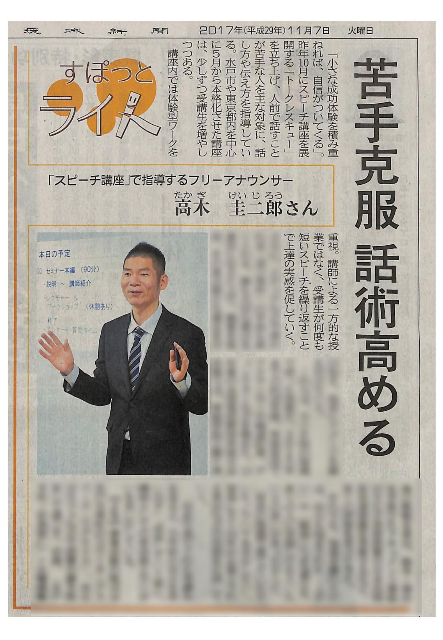2017年11月の茨城新聞でこのスピーチ講座トークレスキューの活動が紹介されました。